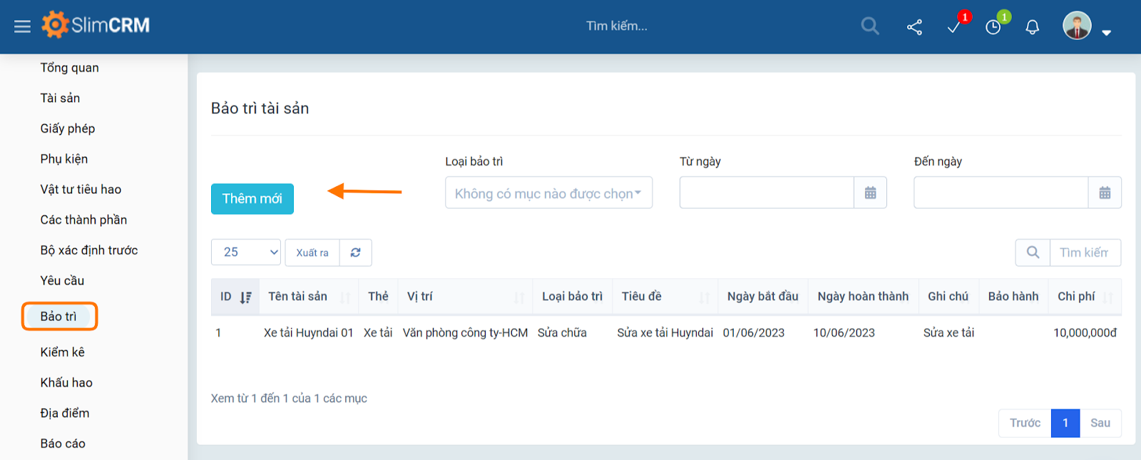 ### **Thêm mới hoạt động bảo hành, bảo trì tài sản**