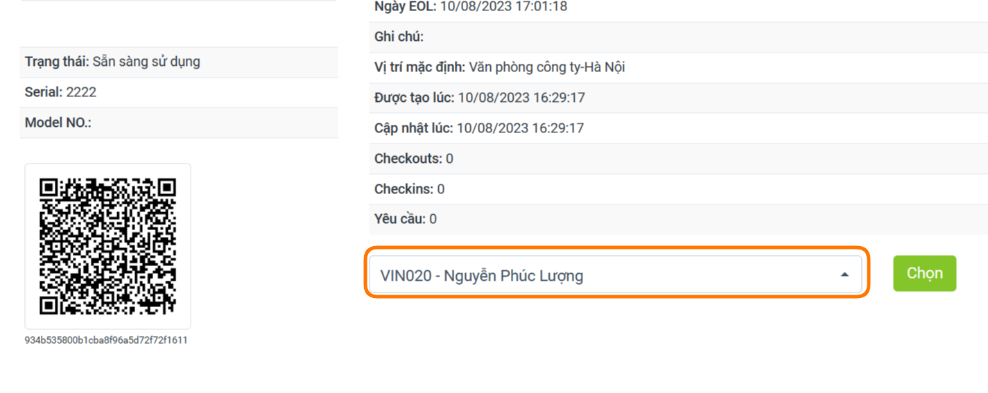 Sau khi click vào tài sản đã tạo, chọn **\[ Check in ]** để nhập lại tài sản về nơi quản lý hoặc **\[ Check out ]** để đăng ký sử dụng&#x20;