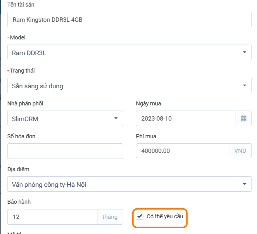 Điều kiện: sản phẩm được tích chọn “Có thể yêu cầu” ở danh mục **\[ Tài sản ]**